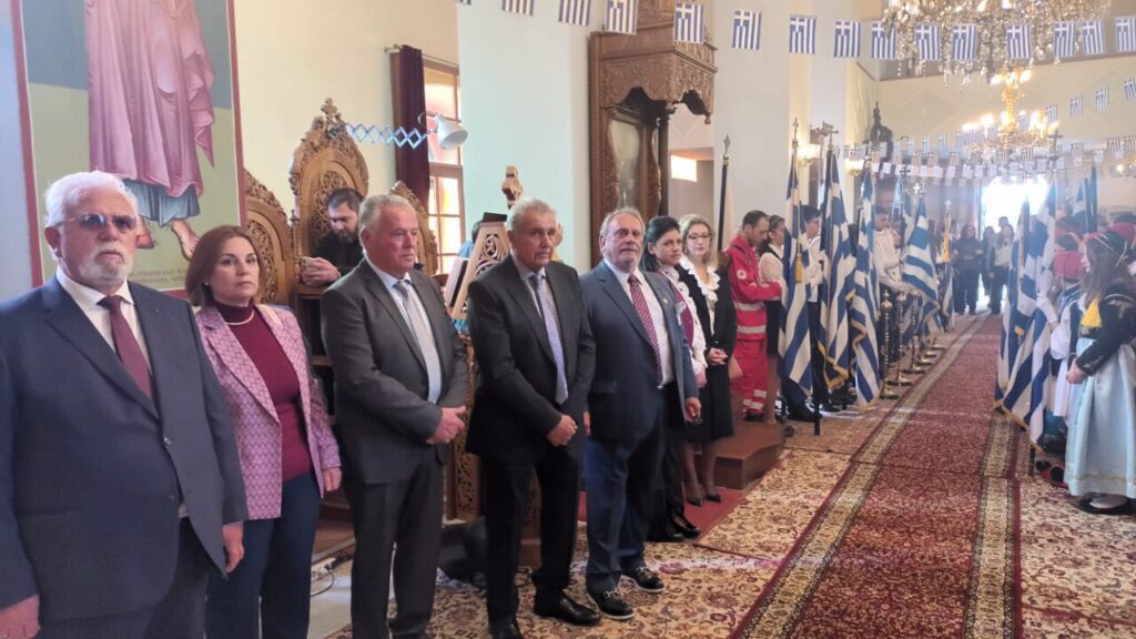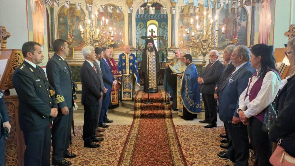Οι επετειακές εκδηλώσεις ξεκίνησαν με δοξολογία στον Ιερό Ναό Αγίου Αθανασίου, με τους σημαιοφόρους των σχολείων να σηκώνουν τις ελληνικές σημαίες ψηλά και μέσα στην εκκλησία.