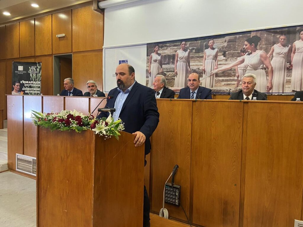 Θέλω να ευχαριστήσω θερμά το Επιμελητήριο Ηλείας για την πρόσκληση. Είναι μεγάλη χαρά να βρισκόμαστε εδώ. Να είμαστε μαζί σας σε μια μεγάλη στιγμή, η οποία συμβολίζει για πάντα τον τόπο προέλευσης των Ολυμπιακών Αγώνων. Συμβολίζει τις διαχρονικές αξίες και τα ιδανικά του Ολυμπισμού.