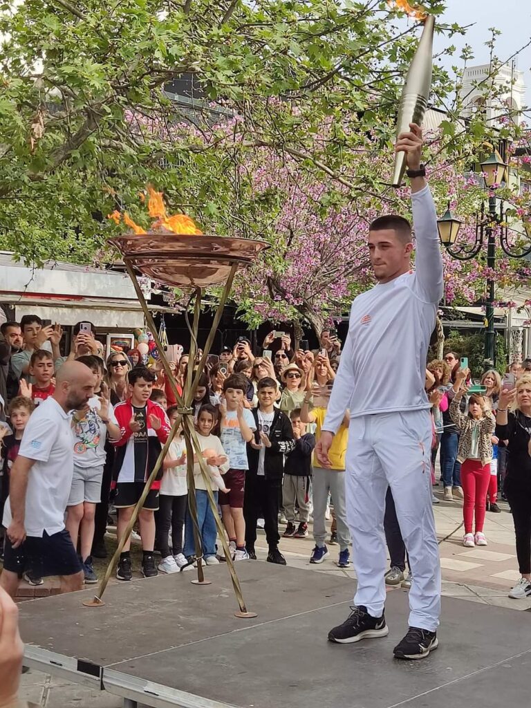 καταφθάνει στην πόλη του Πύργου και ανάβει με τη δάδα του την φλόγα της πόλης
