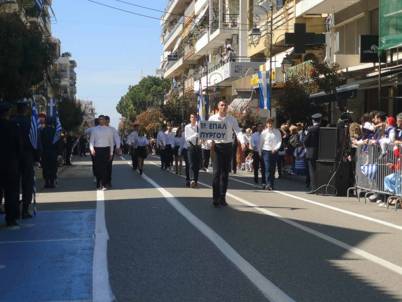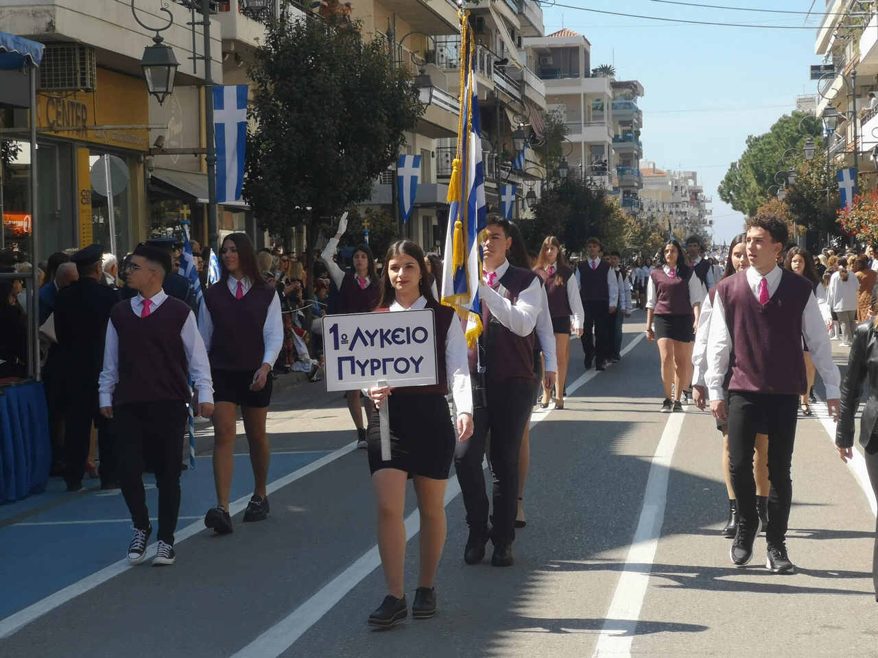 Επίκεντρο των εκδηλώσεων, ο Πύργος, όπου και πραγματοποιήθηκε η καθιερωμένη παρέλαση με την συμμετοχή μαθητών, σπουδαστών, προσκόπων, οδηγών, Ε.Ε.Σ., Λυκείου των Ελληνίδων Πύργου, Λαογραφικών Ομίλων, Συλλόγων, Σωματείων, τμημάτων των Ενόπλων Δυνάμεων και σωμάτων ασφαλείας. Τιμητικά, συμμετείχε στην παρέλαση και το φιλοξενούμενο Τμήμα του Ιερού Λόχου “Αλέξανδρος Υψηλάντης και Μακεδονικού Αγώνα.