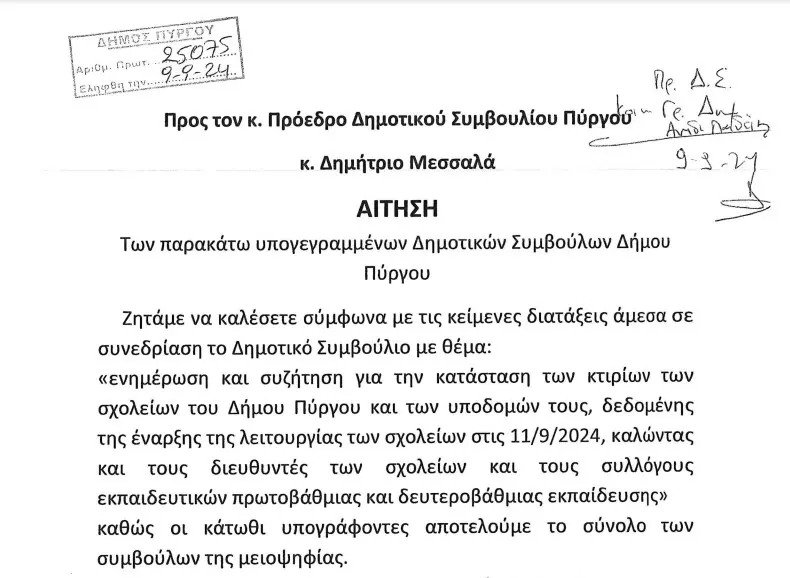 Πύργος: Αίτημα της αντιπολίτευσης για συνεδρίαση του Δ.Σ με θέμα την κατάσταση των Σχολείων