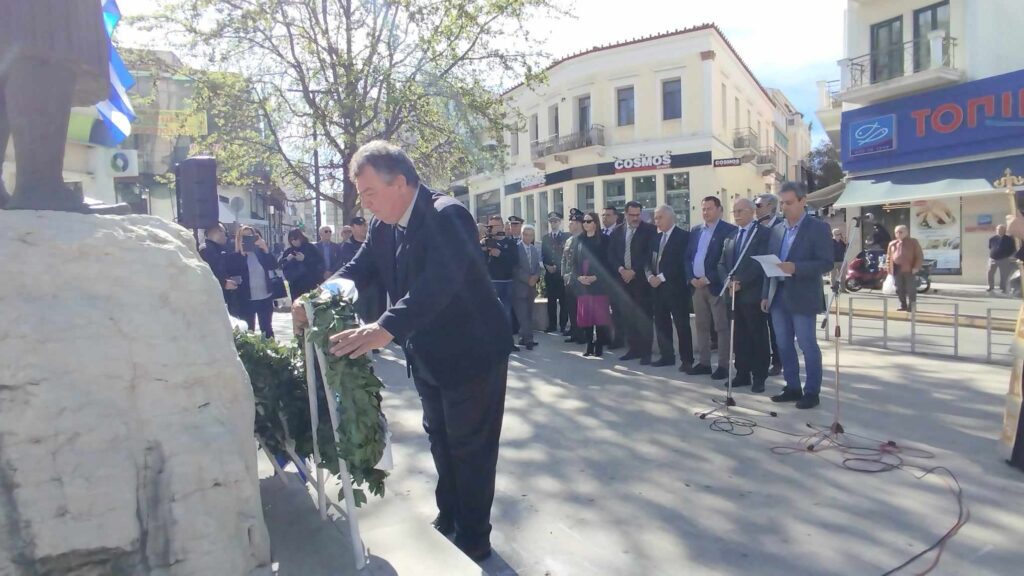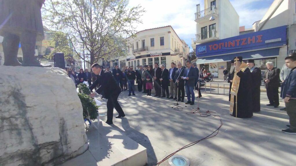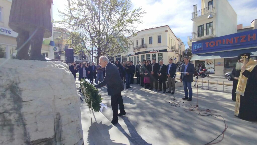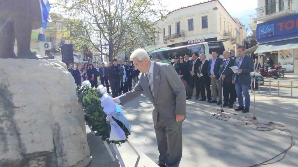 Αμέσως μετά ακολούθησε επιμνημόσυνη δέηση στον ανδριάντα του Θεόδωρου Κολοκοτρώνη στην πλατεία μπροστά από τον ΟΤΕ και κατάθεση στεφάνων από τον Δήμαρχο Πύργου κ Ευστάθιο Καννή, τους προέδρους των παραρτημάτων Ηλείας της Ε.Α.Σ. λοχαγό ε.α κ. Θανάση Τσιγκρέλη και της Ε.Α.Α.Ν πλοίαρχο ε.α. κ Ζώη Υφαντή π.ν. , τον Γραμματέα του παραρτήματος Ηλείας της Ε.Α.Α. Α. σμήναρχο ε.α και πρώην αντιπρόεδρο του Συλλόγου Γορτυνίων κ Χρήστο Παρασκευόπουλο.